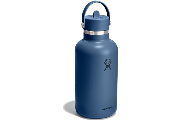 64 OZ HARBOR BLUE BOTTLE: Flip it and sip it with the Hydro Flask Wide Mouth insulated water bottle with closeable straw cap. With a comfortable, flexible handle, the leakproof straw cap is easy to open and close, for on-demand hydration. Double-wall insulation keeps drinks cold up to 24 hours.