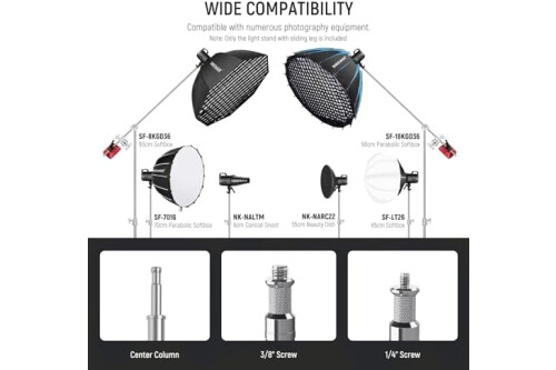 【Adjustable Height & Extension Arm】 The center column with 3 sections is adjustable from 5.2ft to 10.8ft (158cm to 330cm) with a foam grip to prevent slipping in transit. The 4.2ft (128cm) extension arm with a 1/4” and 3/8” mounting screw on both ends is compatible with most equipment