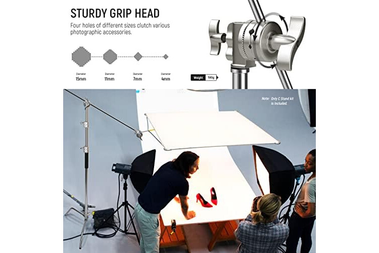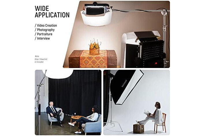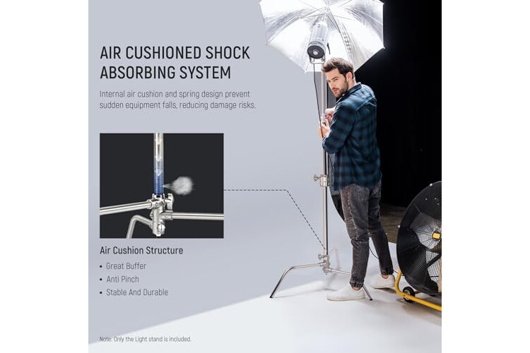 【Heavy Duty Air Cushion Spring Loaded Light Stand】 Made of 100% robust stainless steel, this C stand can mount strobes, monolights, reflectors, softboxes, umbrellas, and other photography gear with exceptional stability. Internal air cushion and spring design prevent sudden equipment falls, reducing damage risks