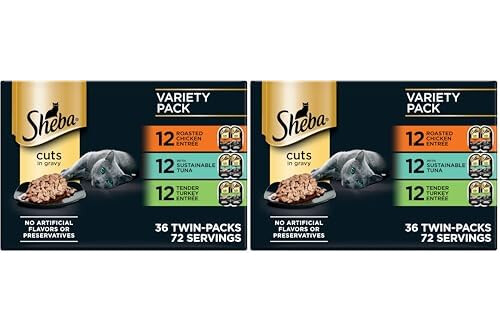 Sheba Perfect Portions Wet Cat Food Cuts in Gravy,Roasted Chicken Entree,with Sustainable Tuna,Tender Turkey Entree,2.6 oz. Twin-Pack Trays (,72 Servings),36 Count (Pack of 2)