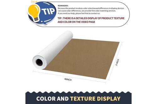 Classic Size: 8 x 48 inches leather repair tape, you can cut any size as needed. Leather texture is soft and smooth, medium thickness, good repair leather repair tape. Professional Leather Repair: leather repair kit are made of high-quality leather,with classic textures and colors. The surface of the leather repair patch is smooth, waterproof and wear-resistant. Onine leather repair patches are strong repair capabilities. Leather Repair patches can be used to repair scratches, tears, holes, burns or cracks, as well as uneven or curved surfaces, meeting your repair needs. Renew your favorite furniture! CONVENIENT AND EASY TO USE:Leather repair patch comes with glue and easy to use. You only need to clean the repair area to keep it dry, cut it out to a suitable size, peel off the backing paper, and stick it to the damaged area to make its surface look new! Wide Applications: leather tape for furniture for repairing/refurbishing sofas, leather recliners, car seats, motorcycle seats, leather furniture, wallets, boots, leather jackets, belts, luggage, and vinyl leather furniture. Our Service - We have over 20 classic leather colors to choose from. Please carefully compare the textures and colors on the detailed page before purchasing, choose the appropriate color. If you have any color concerns, please contact us and we will provide complimentary color matching services.