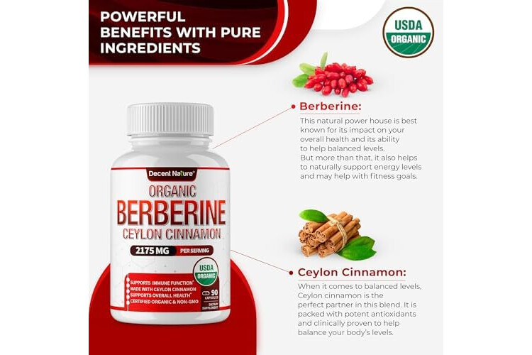 Organic Berberine with Ceylon Cinnamon 2175mg - Premium berberine supplement high purity extract USDA Organic, support immune system, Berberine Plus Complex, Non-GMO Vegan for Men Women 90 Capsules