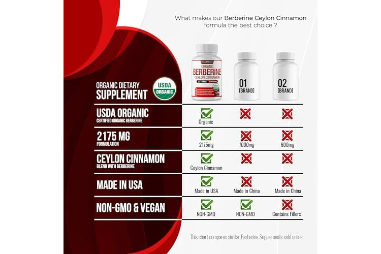 Nature’s Superior Formula - Each serving of our Organic Berberine brings you the very best that nature has to offer for your health. We combine Organic Berberine with Ceylon Cinnamon to help you feel balanced and energetic all day long. With 2175 mg packed in every serving and 90 capsules per bottle, our non-GMO Organic formula will support you everyday throughout the month. Get ready for a more vibrant and health-focused life.