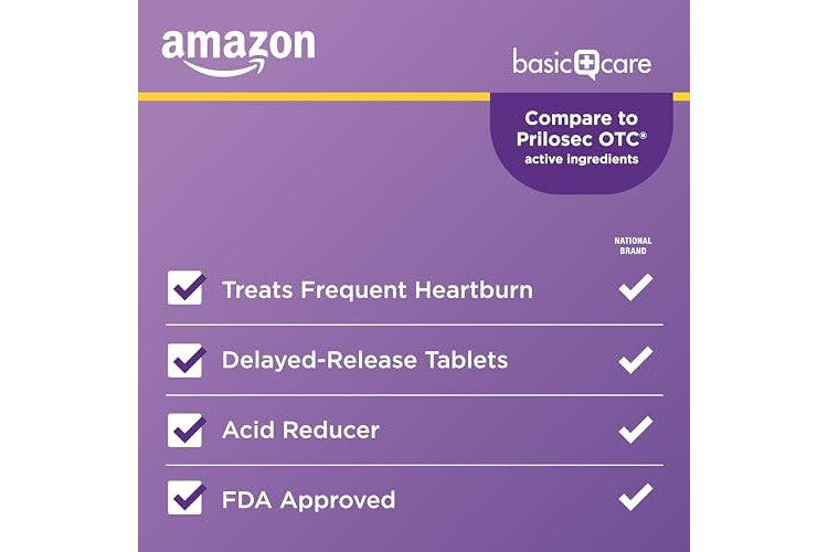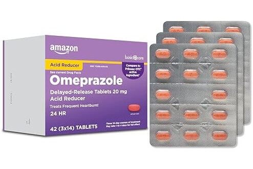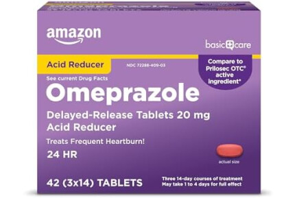 Amazon Basic Care Omeprazole Delayed Release Tablets 20 mg, Treats Frequent Heartburn, Acid Reducer, Heartburn Medicine, 42 Count (Pack of 1) (Packaging may vary)