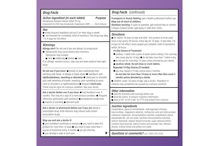 ACTIVE INGREDIENT: The active ingredient in these delayed release tablets is omeprazole 20 mg, which works as an acid reducer to treat frequent heartburn. Compare to Prilosec OTC