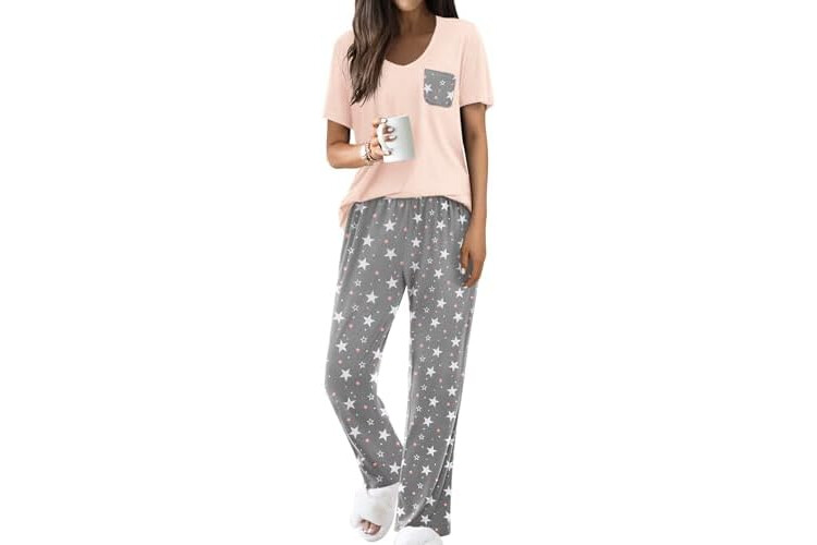 Ekouaer Pajama Sets for Women Short Sleeve Pj Set V Neck Sleepwear Chest Pocket with Long Pants Casual Loose Loungewear