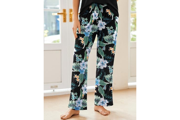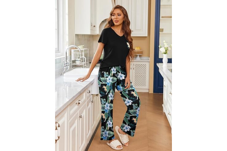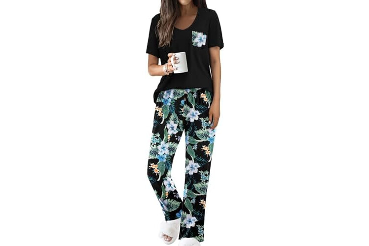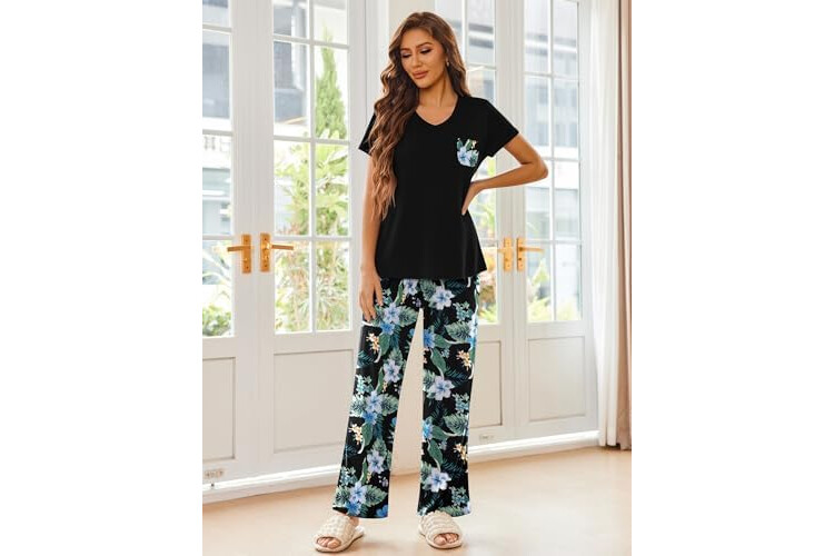 Ekouaer Pajama Sets for Women Short Sleeve Pj Set V Neck Sleepwear Chest Pocket with Long Pants Casual Loose Loungewear