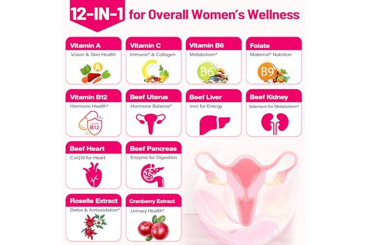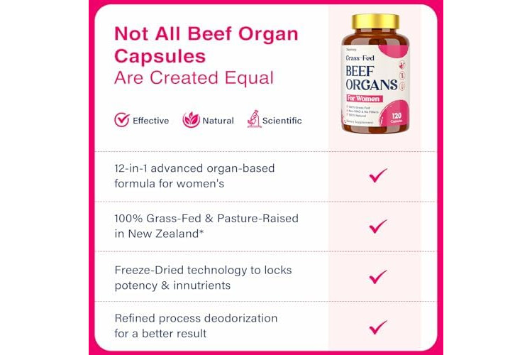 Specifically Designed For Women's Needs: Unlike basic beef liver capsules, we formulated with 12-in-1 powerful designed for women's needs. Complete Organ-Vitamin-Herb for Women Health, feel the Multi-Benefits with 5 grass-fed beef organs (1250mg), 5 vitamins and 2 herbs. 5 beef organs provide natural iron, CoQ10 & nutritional cofactors, 5 vitamin complex enhances bioavailability & effectiveness. Roselle & cranberry is good for antioxidant & urinary health. All-in-one give you the best results!