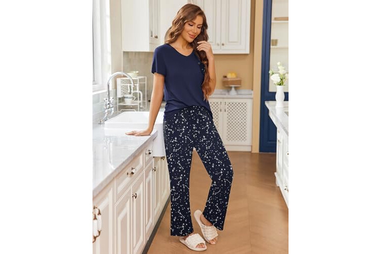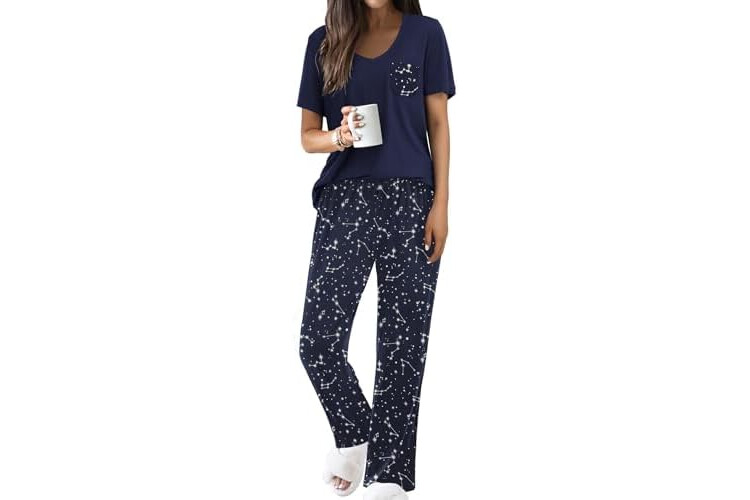 Ekouaer Pajama Sets for Women Short Sleeve Pj Set V Neck Sleepwear Chest Pocket with Long Pants Casual Loose Loungewear