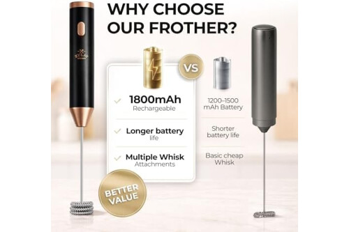 INCLUDES 4 VERSATILE WHISK ATTACHMENTS: Comes with a single coil whisk for light froth, a triple coil whisk for dense foam, an egg beater for churning and a balloon whisk for blending and whipping. Easily swap attachments to match your drink or recipe needs.