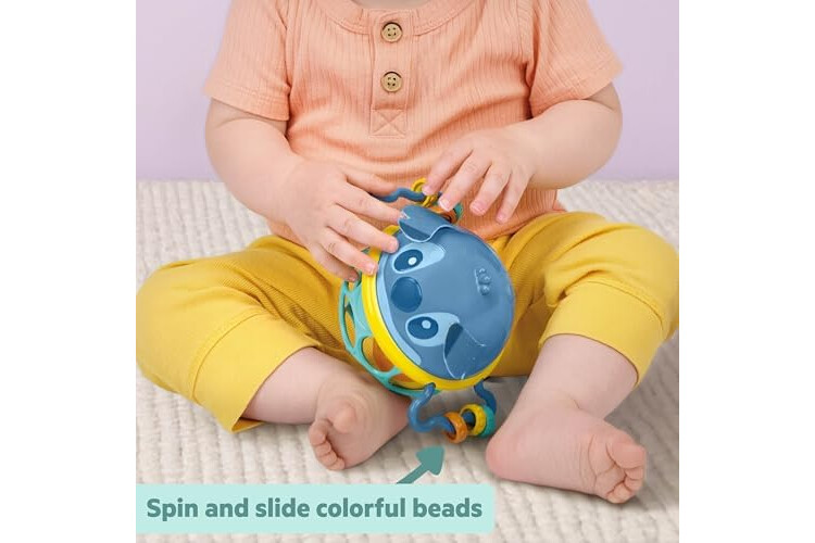 Grasp the flexible Oball for fine motor skill development, shake the jingle ball to engage auditory senses, and spin the colorful beads for tactile stimulation