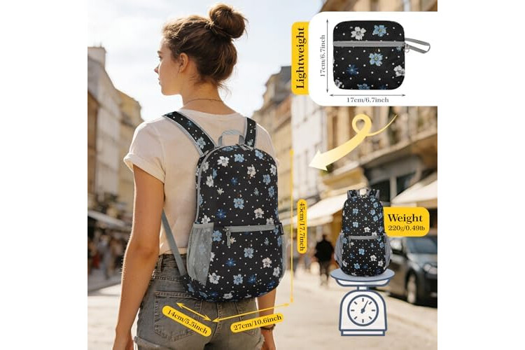 0.5 POUNDS OF PORTABLE ULTRA LIGHTWEIGHT PACKABLE BACKPACK: The size of the travel backpack packable is 17.71 x5.5x 10.6 inches,and the folding size is 6.7 x 6.7 x 1.97 inches.The lightweight foldable backpack is an ideal luggage bag for a plane.When it is not used,fold it into a compact pocket (sandwiches size).It can be stored in anywhere in pockets,luggage,handbags,etc
