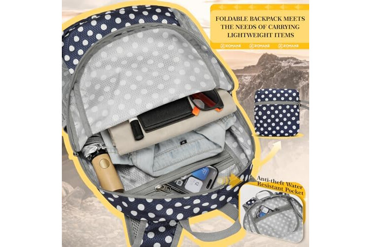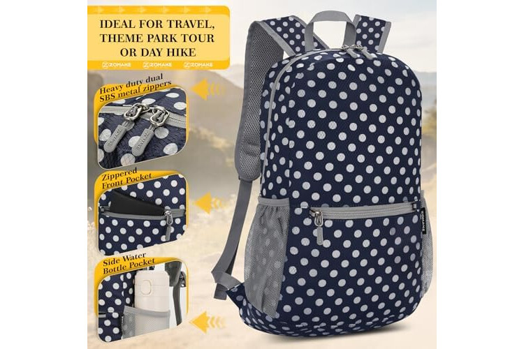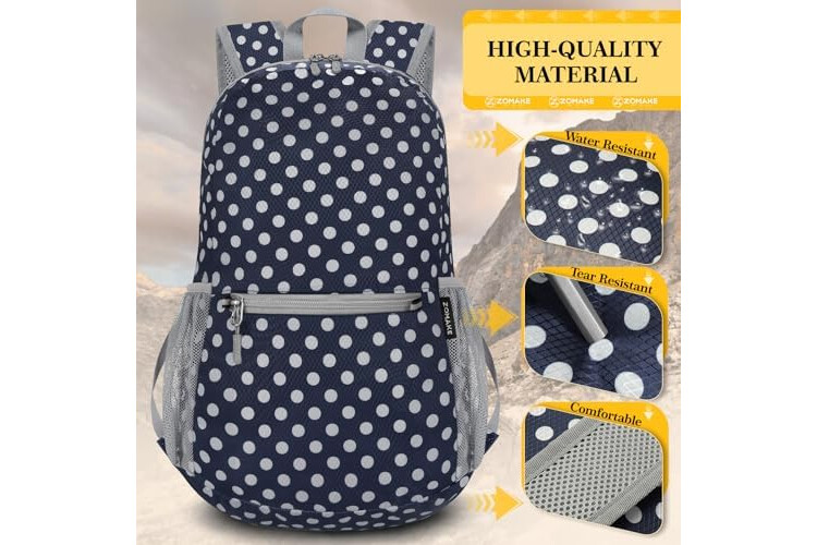 ZOMAKE Ultra Lightweight Hiking Backpack 20L, Packable Small Backpacks Water Resistant Daypack for Women Men(Navy Blue,White polka dots)