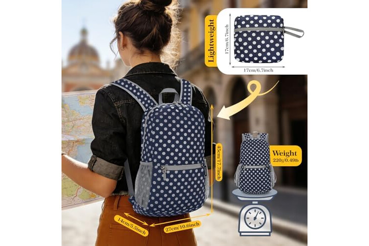 0.5 POUNDS OF PORTABLE ULTRA LIGHTWEIGHT PACKABLE BACKPACK: The size of the travel backpack packable is 17.71 x5.5x 10.6 inches,and the folding size is 6.7 x 6.7 x 1.97 inches.The lightweight foldable backpack is an ideal luggage bag for a plane.When it is not used,fold it into a compact pocket (sandwiches size).It can be stored in anywhere in pockets,luggage,handbags,etc