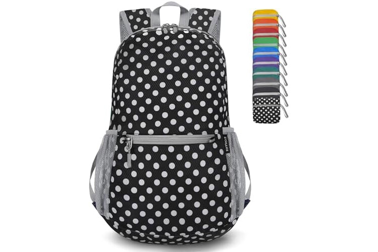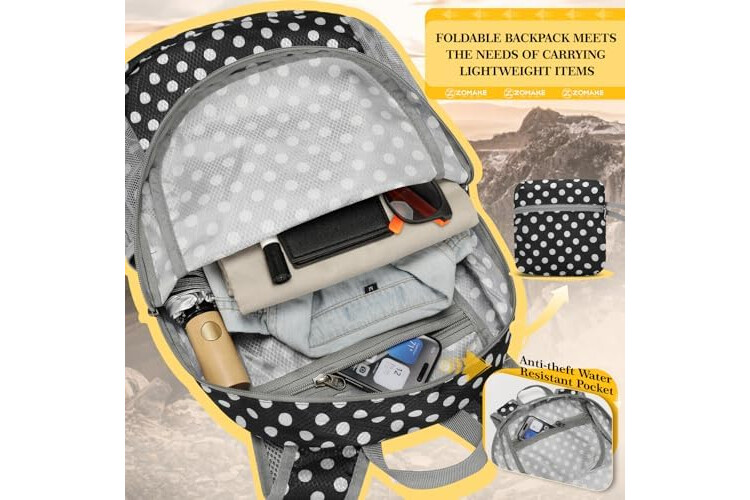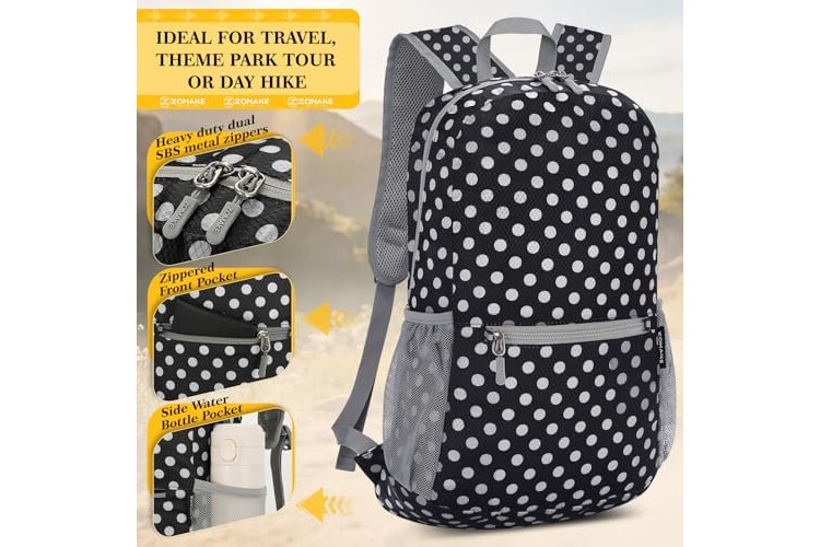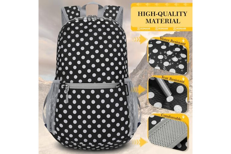 ZOMAKE Ultra Lightweight Hiking Backpack 20L, Packable Small Backpacks Water Resistant Daypack for Women Men(Black,White polka dots)