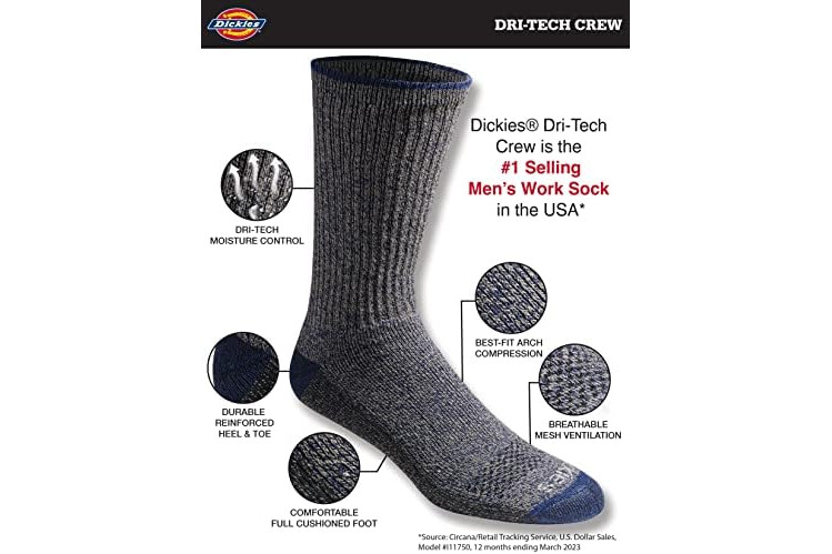 Dickies Men's Dri-tech Original Moisture Control Crew Socks Multipack, Black (6 Pairs), Shoe Size: 6-12, Pack of 6