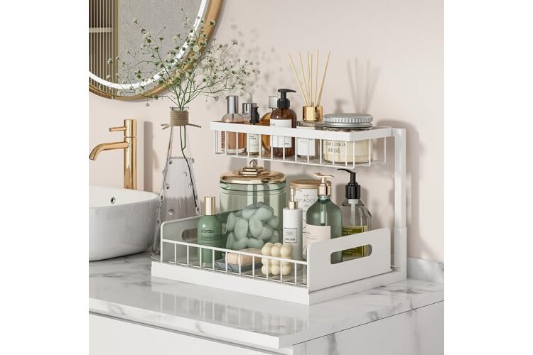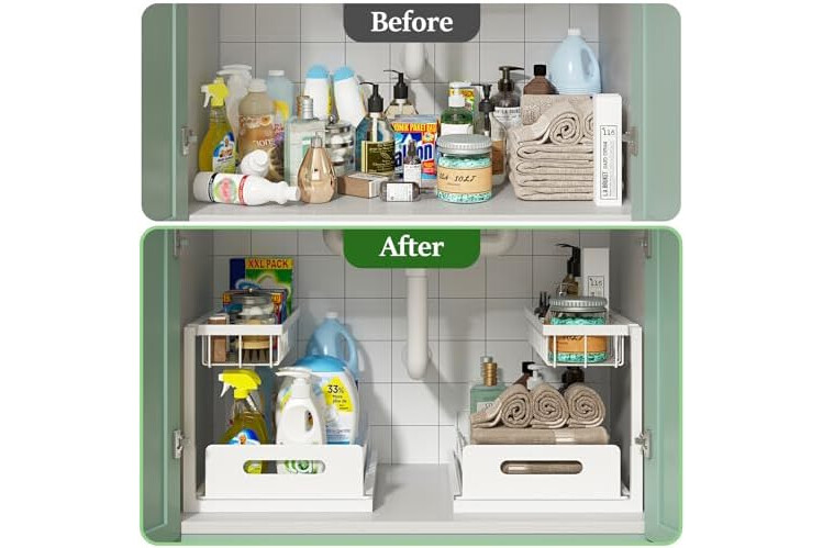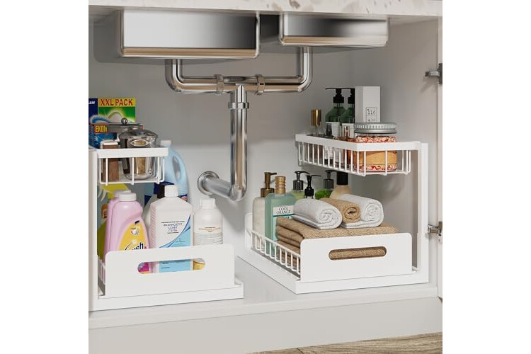 【HOLDS UP TO 50 LBS — METAL FRAME BUILT TO LAST】 The all-metal frame supports up to 50 lbs total. Baked-on coating resists moisture and cleaning spray. This under-sink organizer holds its shape year after year, unlike plastic shelves that sag over time.