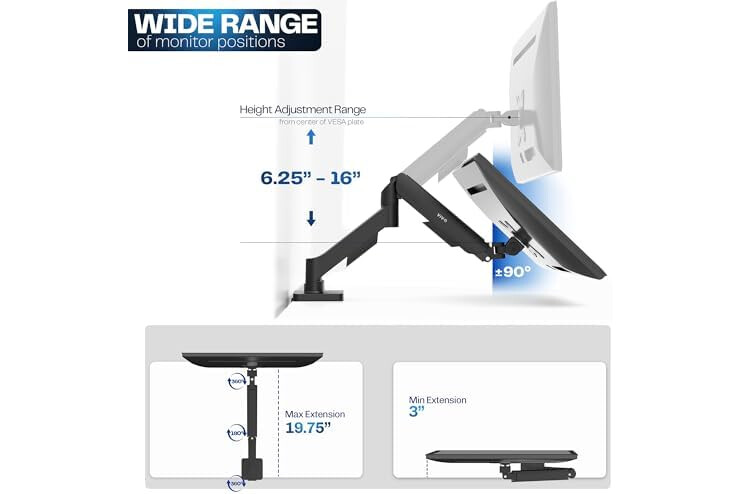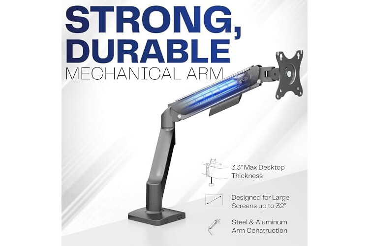 Mechanical Spring Adjustment: Toolless monitor placement with perfect counterbalance presentation in all directions. Please Note: The back of the arm will extend past the edge of your desk