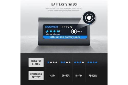 【4 Battery Status Indicators】 4 LED indicators display battery levels at 100%, 75%, 50%, and 25%. Just press the "CHECK" button to activate the indicators, and then you can know the current battery status with a glimpse