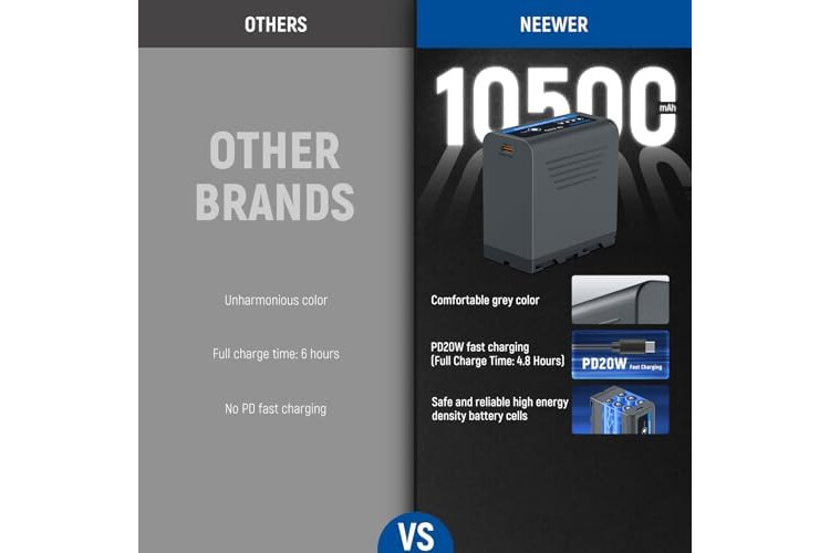 Neewer 10500mAh NP-F970 Replacement Battery, 4.8Hrs Full Charge Time, 20W PD Fast Charging USB C Cable, Rechargeable Camera Camcorder Video Light Monitor Battery for Sony NP-F550 F750 F950 F970, Gray