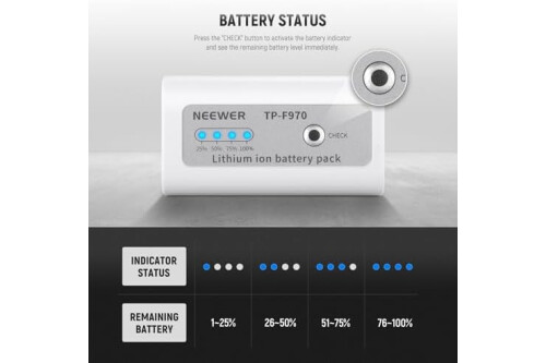 【4 Battery Status Indicators】 4 LED indicators display battery levels at 100%, 75%, 50%, and 25%. Just press the "CHECK" button to activate the indicators, and then you can know the current battery status with a glimpse