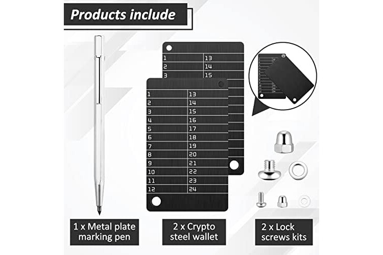 | Included Components | 2 x steel bitcoin wallets, 1 x metal number plate marker pen |