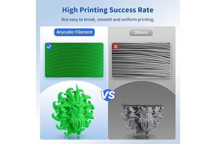 【Accuracy & Consistency】 Anycubic 3D Printer PLA filament of 1.75mm diameter, Minimum dimensional tolerance +/- 0.02mm, which makes filament outflow smoother, came out homogeneous. The low shrinkage and stable printing dimensions make the fusion between the layers very good to obtain an even better-bridging result. You don't worry the diameter changes a lot then the feed rate is disrupted with thicker and thinner layers at all.