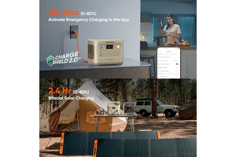 One Hour Fast Charging: Charge your Explorer 1000 v2 Portable Power Station from 0% to 100% battery level in just one hour with emergency charging activated via the Jackery App. It defaults to 1.7 hours for a full charge to optimize battery health. Engineered with advanced ChargeShield 2.0 technology, this power station charges safer, faster, and smarter.