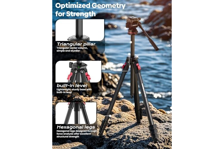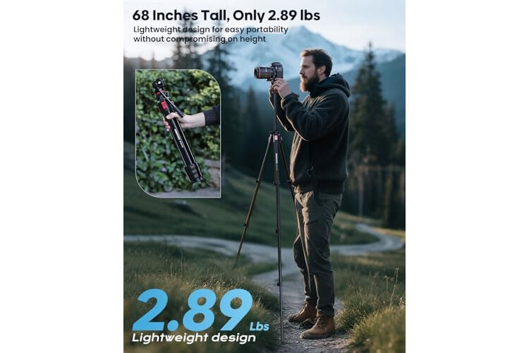【Versatile and High Load Capacity】 With three-section leg locks, the tripod extends to a maximum height of 68 inches and can be adjusted down to 18.5 inches. The angle locks also offer three adjustable positions. The reversible center column enables low-angl...