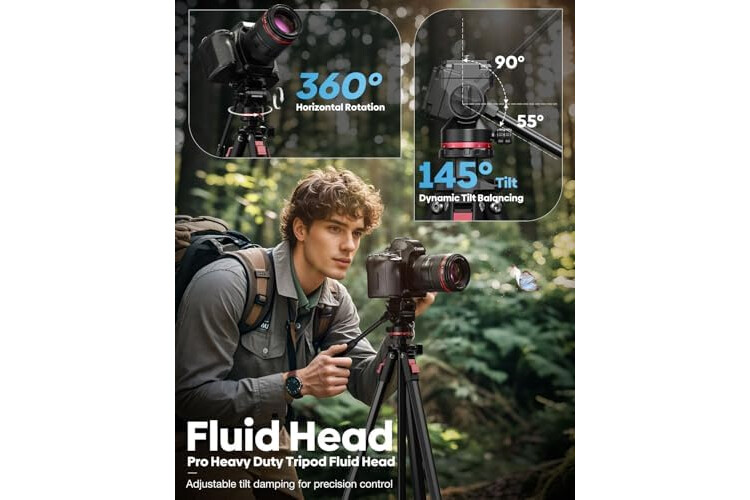 【360° Pan and Tilt Fluid Head】 The aluminum fluid head weighs just 0.88 lbs, featuring hydraulic damping technology for smooth and fluid movements. The tripod head supports +90°/-55° tilt shots and 360° panorama shots for multi-angle shots. The base is equipped with a 3/8" threaded interface, compatible with most tripods and monopods. The detachable handle allows for customizable left- or right-handed operation.