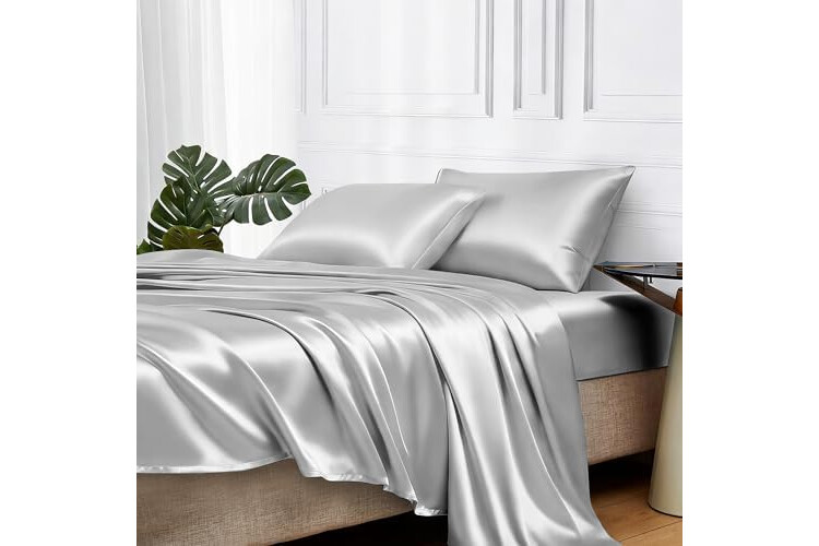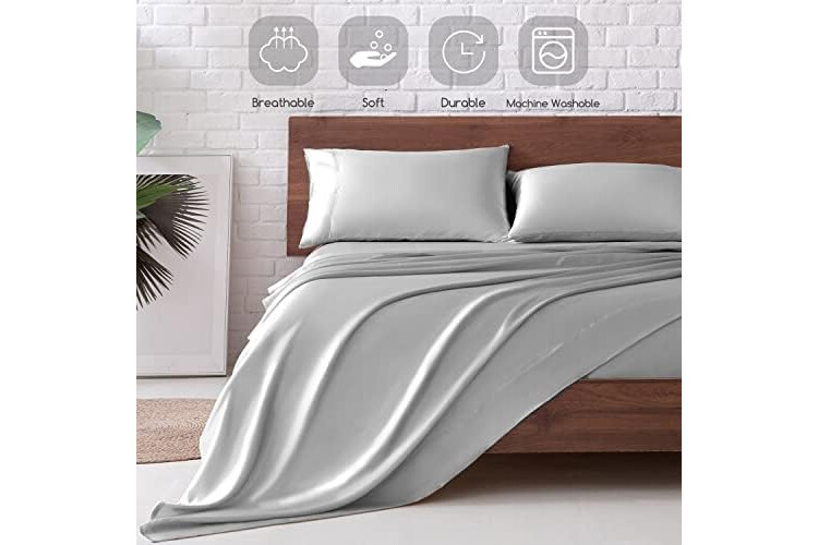 MR&HM Satin Bed Sheets, Full Size Sheets Set, 4 Pcs Silky Bedding Set with 15 Inches Deep Pocket for Mattress (Full, Silver Grey)