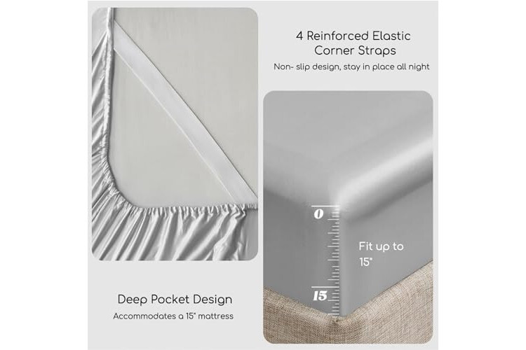 Full Size Bed Sheets Set 4 Pcs: Our package includes 1 Flat Sheet: 81"x 96", 1 Fitted Sheet: 54"x 75" + 15" Deep Pocket, 2 Pillowcases: 20"x 30". Reinforced elastic corner straps securely wrap around your mattress, effortlessly solving the slipping issues of satin and letting you enjoy a smooth, comfortable night.