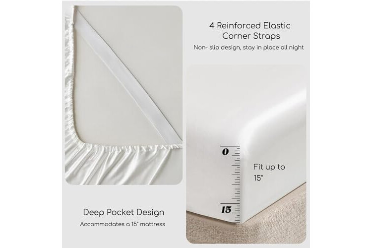 Full Size Bed Sheets Set 4 Pcs: Our package includes 1 Flat Sheet: 81"x 96", 1 Fitted Sheet: 54"x 75" + 15" Deep Pocket, 2 Pillowcases: 20"x 30". Reinforced elastic corner straps securely wrap around your mattress, effortlessly solving the slipping issues of satin and letting you enjoy a smooth, comfortable night.