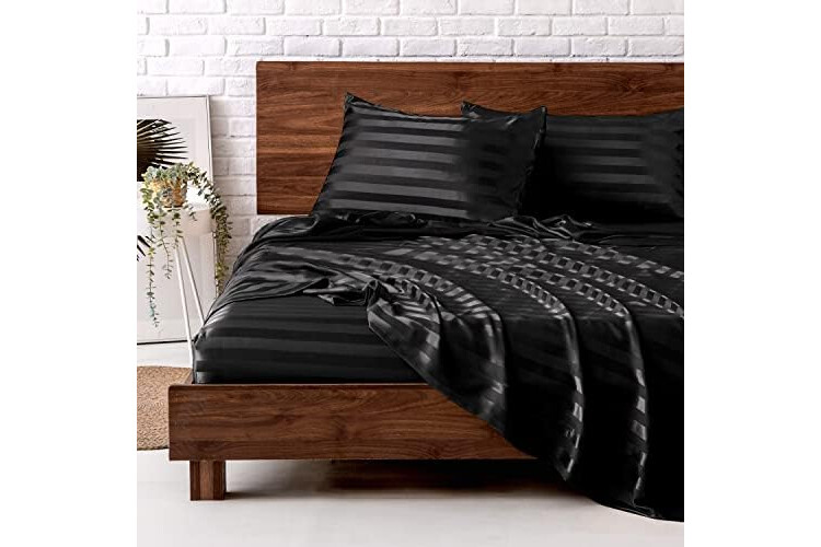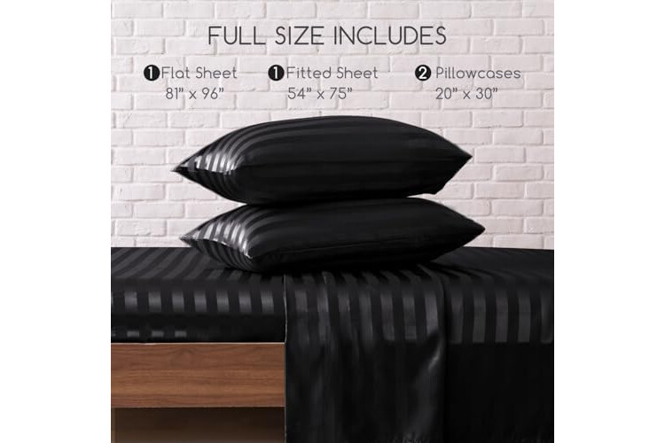 MR&HM Satin Bed Sheets, Full Size Sheets Set, 4 Pcs Silky Bedding Set with 15 Inches Deep Pocket for Mattress (Full, Black Striped)