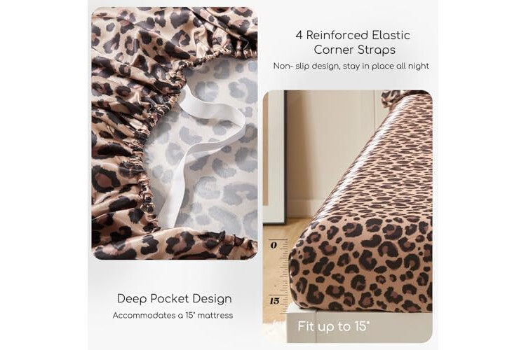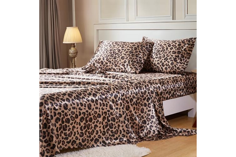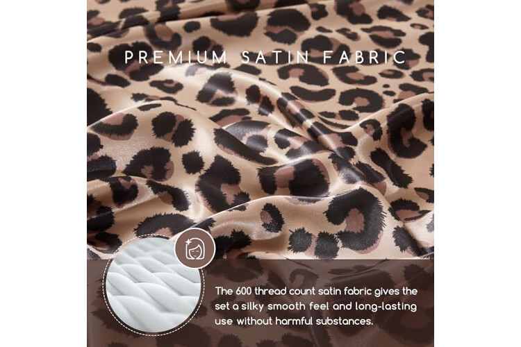 MR&HM Satin Bed Sheets with Elastic Corner Straps, Full Size Sheets Set, 4 Pcs Silky Bedding Set with 15 Inches Deep Pocket for Mattress (Full, Brown Leopard)