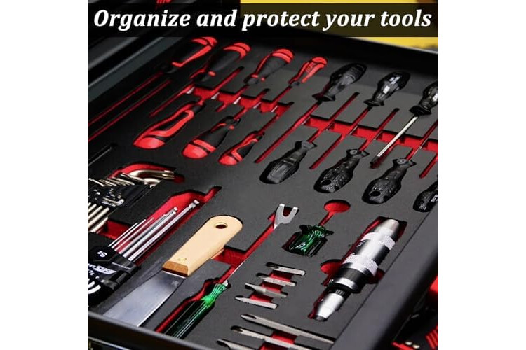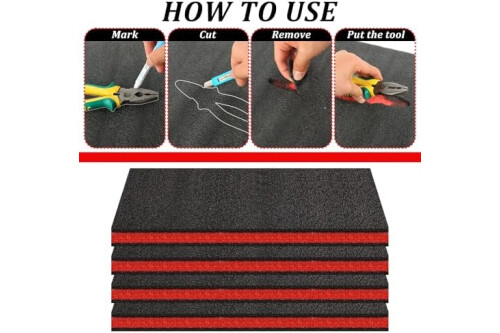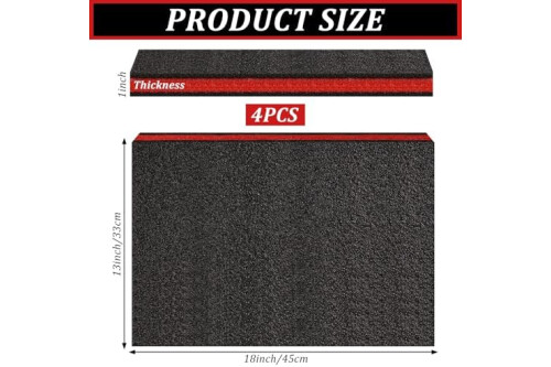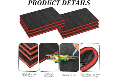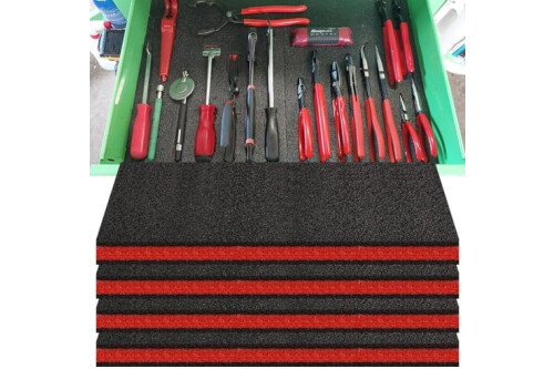4-Piece Toolbox Foam Set: This set includes 6 polyethylene tool foam sheets, each measuring 18 x 13 x 1 inches (46 cm x 33 cm x 25 mm). The drawer liner foam is perfect for lining your toolbox to provide cushioning and protection for your tools and collectibles. Color: Black with Red accents.