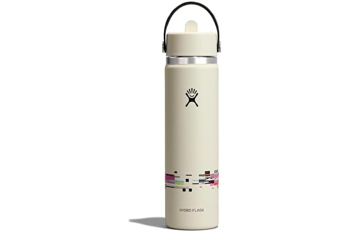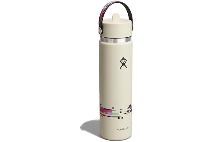24 OZ GLITCH WHITE BOTTLE: Flip it and sip it with the Hydro Flask Wide Mouth insulated water bottle with closeable straw cap. With a comfortable, flexible handle, the leakproof straw cap is easy to open and close with one hand. Double-wall insulation keeps drinks cold up to 24 hours.