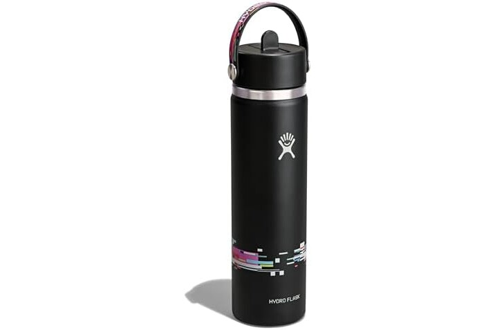 24 OZ GLITCH BLACK BOTTLE: Flip it and sip it with the Hydro Flask Wide Mouth insulated water bottle with closeable straw cap. With a comfortable, flexible handle, the leakproof straw cap is easy to open and close with one hand. Double-wall insulation keeps drinks cold up to 24 hours.