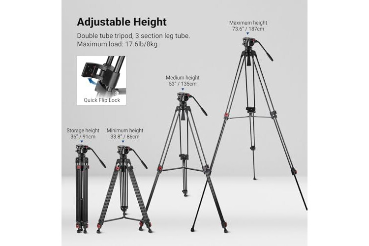 【Versatile Heavy Duty Video Tripod】 TP74 tripod stabilizes a camera or camcorder to take photos and videos of sports, weddings, landscapes, and products. Double tandem aluminum alloy legs provide reliable stability with a max load capacity of 17.6lb/8kg. The mid level spreader and nonslip rubber feet for further stability