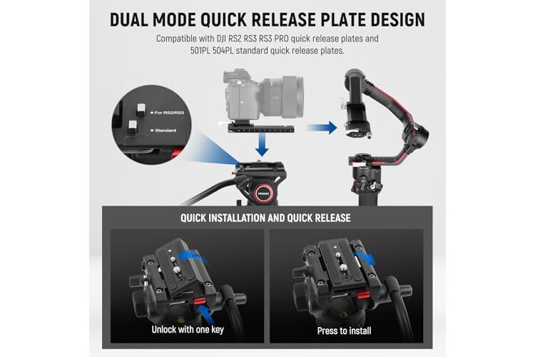 【Quick & Easy Modes Switching】 The fluid head has two QR modes, compatible with DJI RS2 RS3 RS3 PRO gimbal and compatible with Manfrotto 501PL 504PL quick release plates respectively. The quick ...