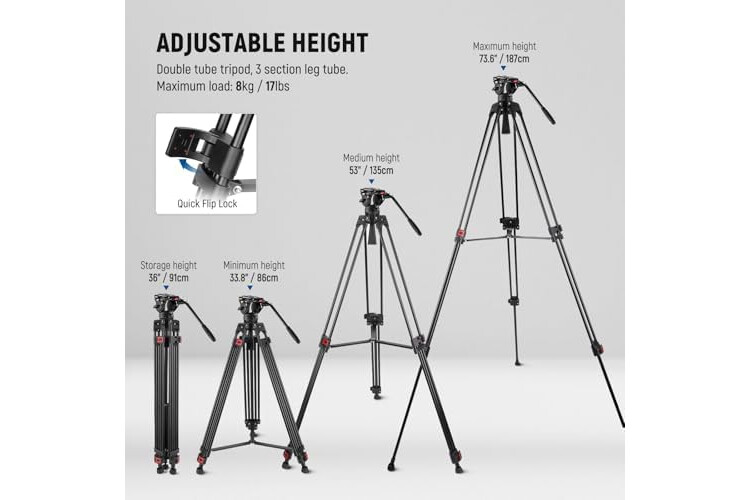 【Versatile Heavy Duty Video Tripod】 TP74 tall tri pod stabilizes a camera or camcorder to take photos and videos of sports, weddings, landscapes, and products. Double tandem aluminum alloy legs provide reliable stability with a max load capacity of 17.6lb/8kg. The mid level spreader and nonslip rubber feet for further stability. Includes a bag for easy carrying and a cleaning cloth to keep it always ready for your photography or videography