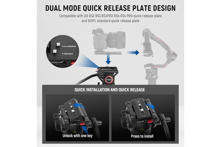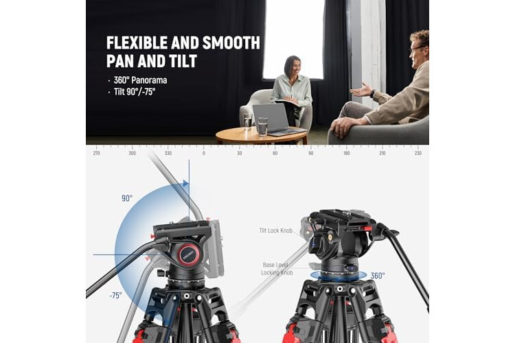 【Premium Fluid Drag Pan Head】 The professional tripod features a fluid drag pan head with a smooth friction damping and balancing system. Supports 360° rotation and -75°/+90° tilt movement. The ø3" (75mm) bowl base with 360° scale and a locking handle ...