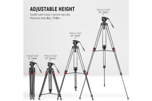 【Heavy Duty Build & Versatile Use】 Crafted from aluminum alloy, the video tripod features multi tubular tripod legs that stand unwavering even when carrying a camera or other professional photography gear up to 17.6lb/8kg, ideal for sports, weddings, landscapes, and product photography, video recording, vlogging, live streaming, and more as content creator essential and influencer must have equipment. The mid level spreader and nonslip rubber feet for further stability