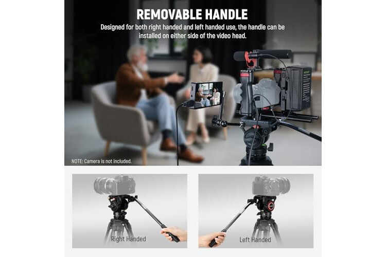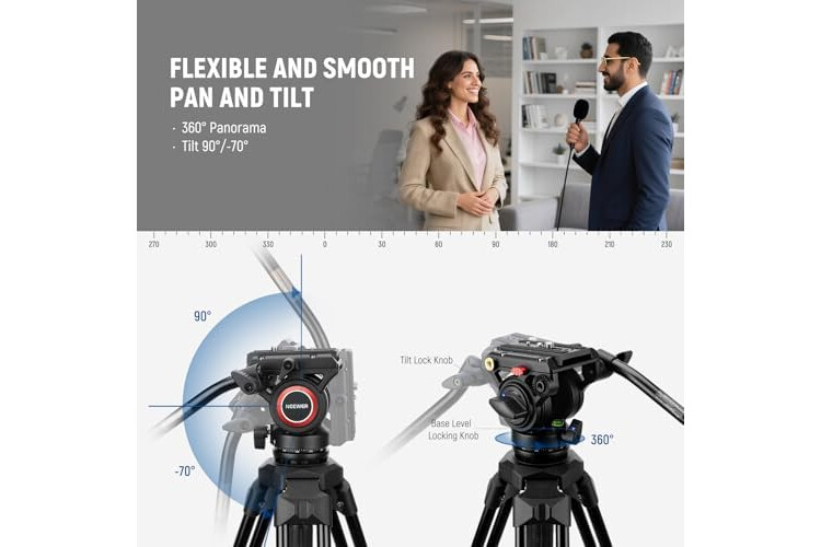 【Premium Fluid Drag Pan Head】 The video tripod features a fluid drag pan head, offers smooth friction damping, and supports 360° rotation with a tilt range of -75° to +90°, with a detachable handle for both left and right handed use. Its 75mm bowl base comes with a 360° scale for capturing sharp panoramic images, and includes a leveling handle and a built in bubble level for rapid leveling. The fluid head is also removable for other tripods with a 75mm base diameter