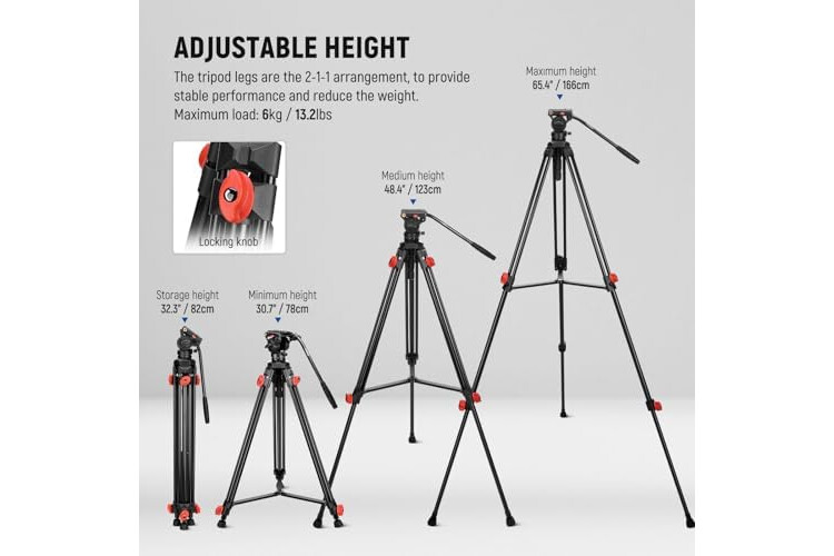 【Heavy Duty Yet Lightweight Camera Tripod】 The aluminum alloy tri pod features a 2-1-1 structure and multi tube design, supporting DSLR cameras up to 13.2 lbs (6 kg) while reducing its weight to 5.95 lbs (2.7 kg), with a 32.3" (82 cm) folded length for indoors and outdoors like products, sports, weddings and landscapes. Adjust from 30.3" (77 cm), 48" (122 cm) to 65" (165cm) with a twist of three leg lock knobs. The mid spread lever allows for quick release and easy setup