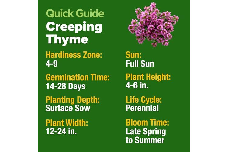 GROW A LUSH, AROMATIC GROUND COVER WITH EASE – Creeping thyme (Thymus serpyllum) seeds germinate in just 14–21 days, making them ideal for beginners. This resilient herb requires minimal maintenance—simply sow, water lightly, and watch your garden transform with natural fragrance and rich texture.