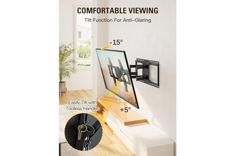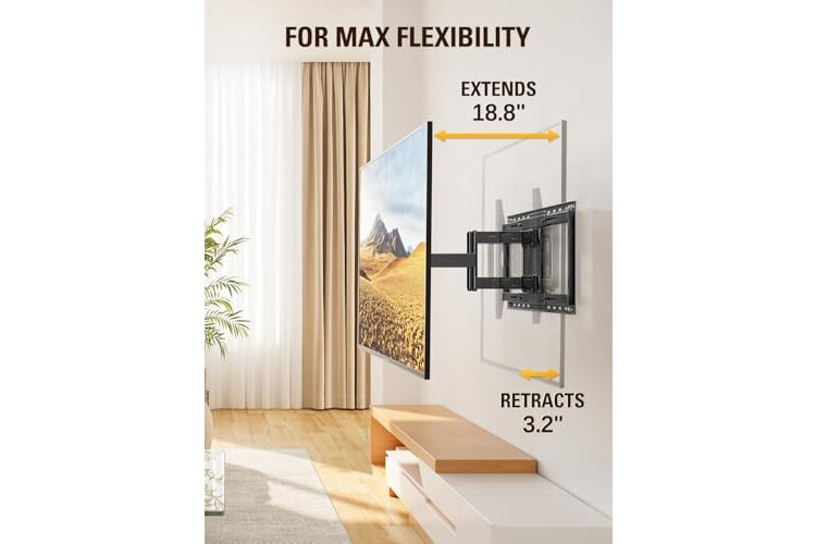 TV Mount Swivel and Tilt: TV mount can tilt TV 5° up and 15° down to reduce glare, swivel the TV left or right 45°. Extending 18.8” and retract back to 3.2”, making your TV alive to move. +/-3° post-installation adjustment allows for perfect TV leveling.