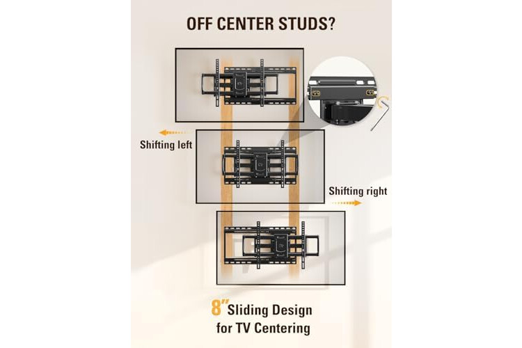 Perfect centered design: Off Center Studs? Full Motion TV Wall Mount with 8" sliding design allows TV shifting left or right, it is easy for TV centering on the wall plate. All our TV mount can not be installed on drywall alone.