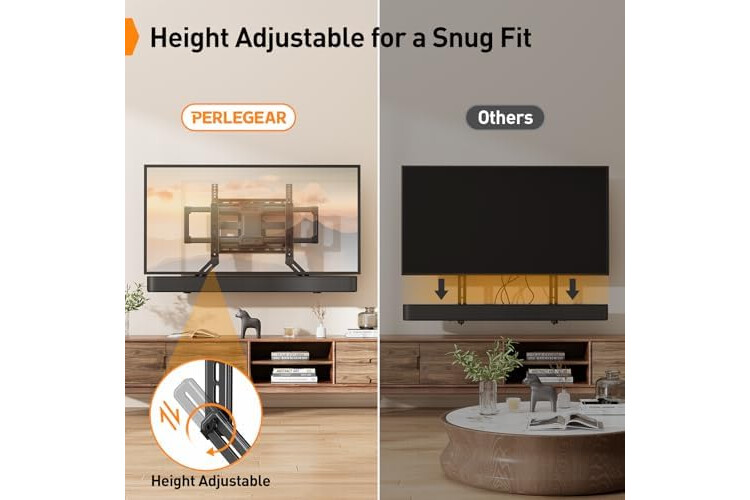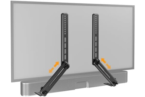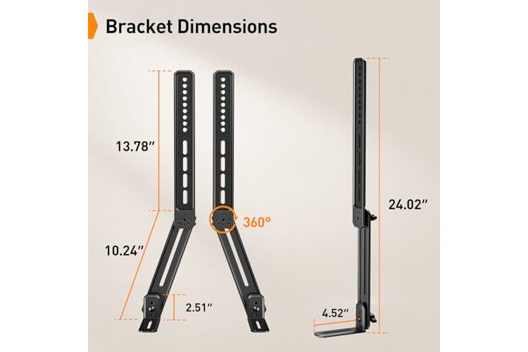 Height Adjustment: The soundbar mounting bracket under TV is designed with tool-free knobs, which can rotate the bracket 360° and extend or retract the extension arms to help adjust the gap between the TV and soundbar, or even adjust it to have no gap, you can easily adjust at any time.