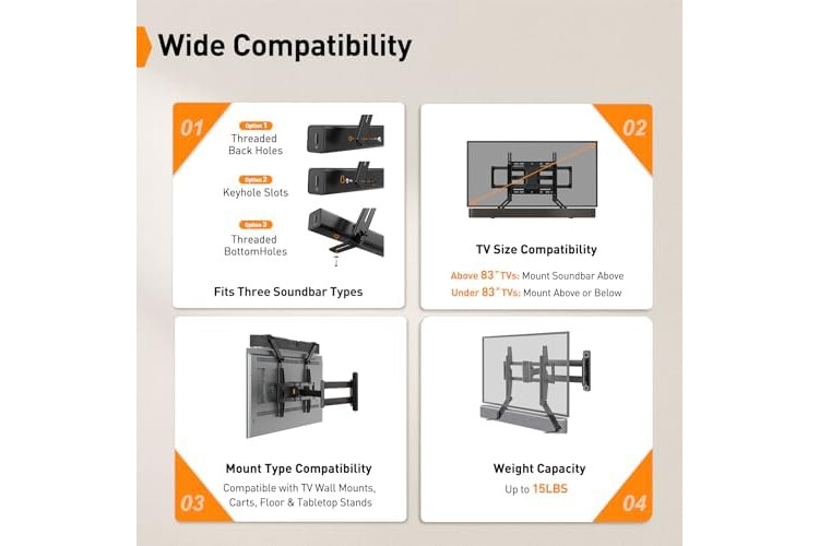 Wide Compatibility: With strong metal construction, Perlegear soundbar mount can support up to 15 lbs for reliable stability. This sound bar mount fits most of sound bars and compatible with TV wall mount, TV cart, floor TV stand and tabletop TV Stand. ( Note: For tabletop TV stands, make sure your have enough clearance underneath the TV. ) For TVs under 83 inches, you can choose to mount the soundbar above or below the TV. For TVs larger than 83 inches, the soundbar will need to be mounted above the TV due to the lack of bracket length. The screws of the sound bar are only compatible with M4*16mm, M5*16mm, M6*16mm, and Key hole bolts.